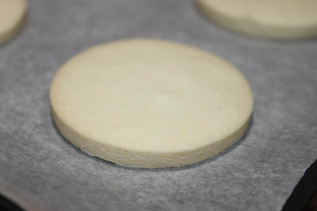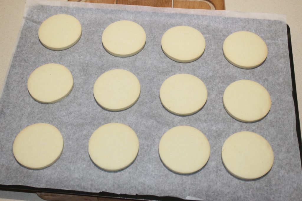 - Avec un emporte-pièce de 6cm, coupez des ronds de pâte que vous placerez sur une plaque à pâtisserie garnie de papier sulfurisé.