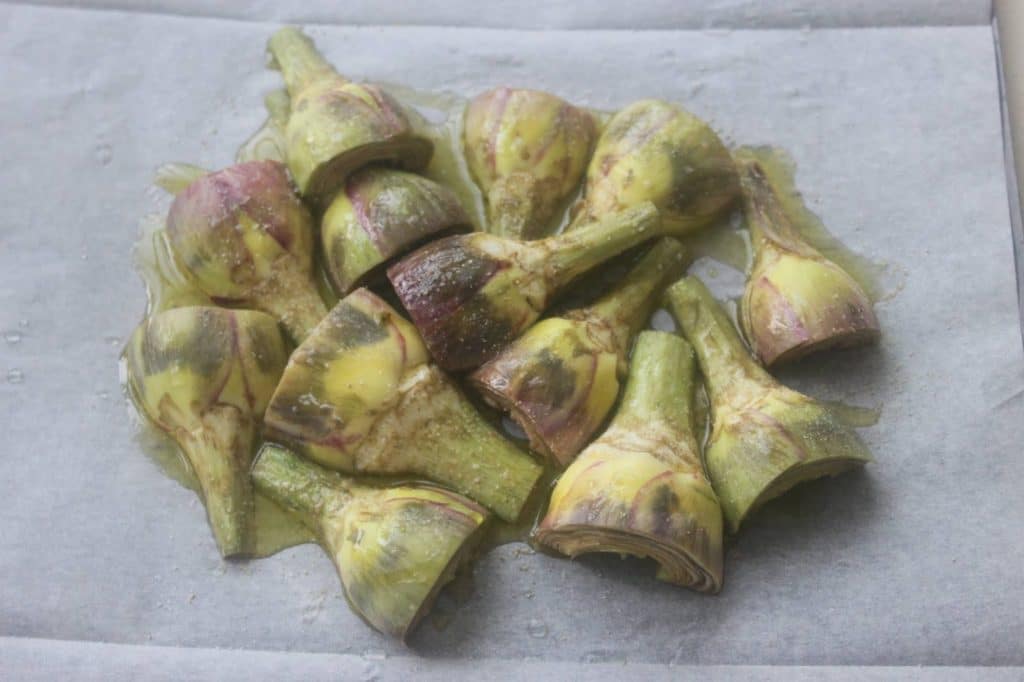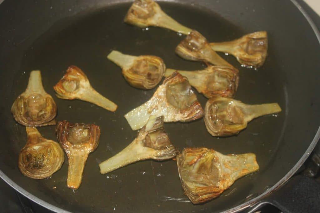 - Versez un peu d’huile d’olive dans une poêle sur feu assez vif et placez les artichauts.