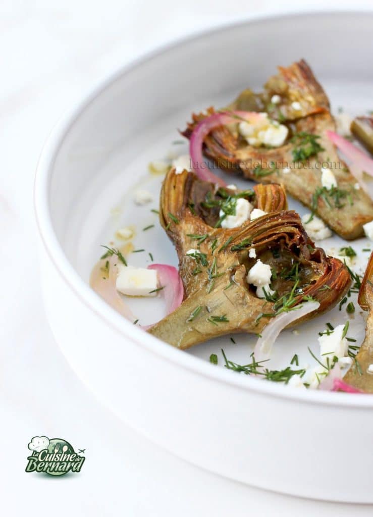 - Dans un plat de service, posez les artichauts, surmontez de feta, de lamelles d’oignon rouge, d’un peu d’aneth ciselé. Salez et poivrez à votre goût puis arrosez d’un peu d’huile d’olive. Il n’y a plus qu’à dévorer !