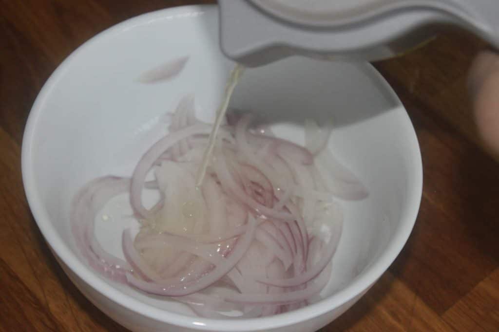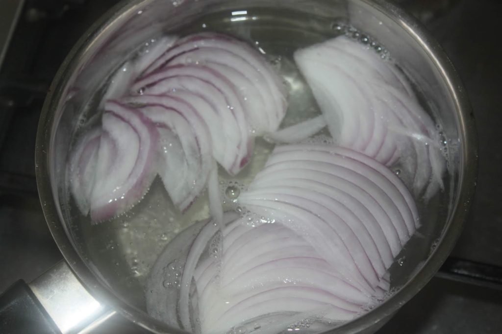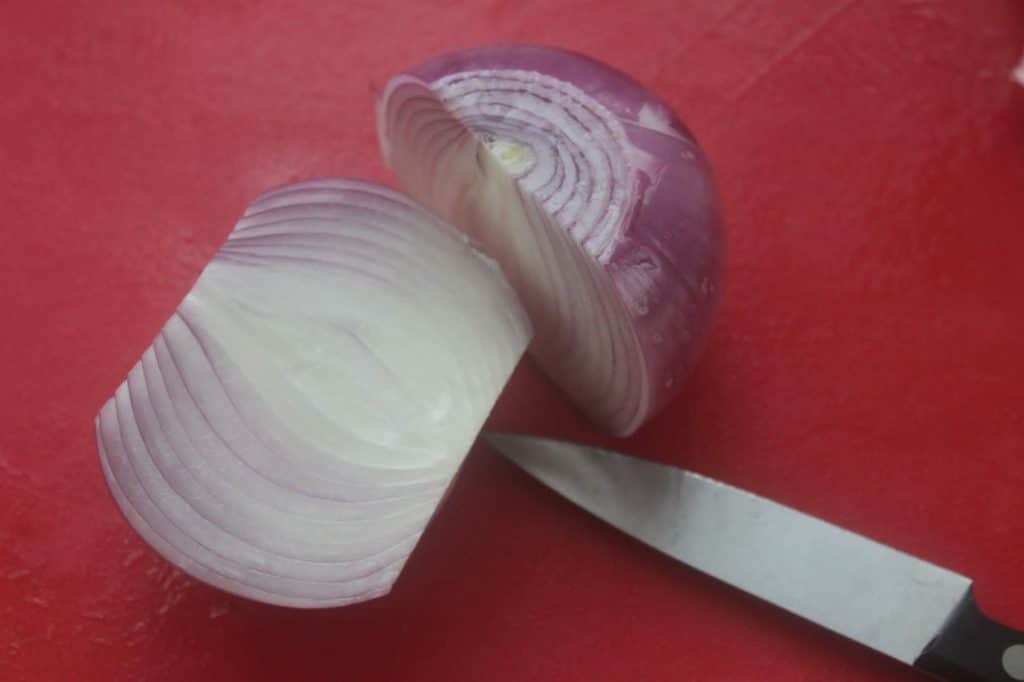 Pendant ce temps, émincez finement un demi oignon rouge épluché.
