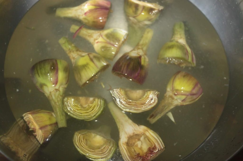 Versez un peu d’huile d’olive dans une poêle sur feu assez vif et placez les artichauts.