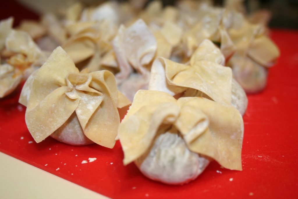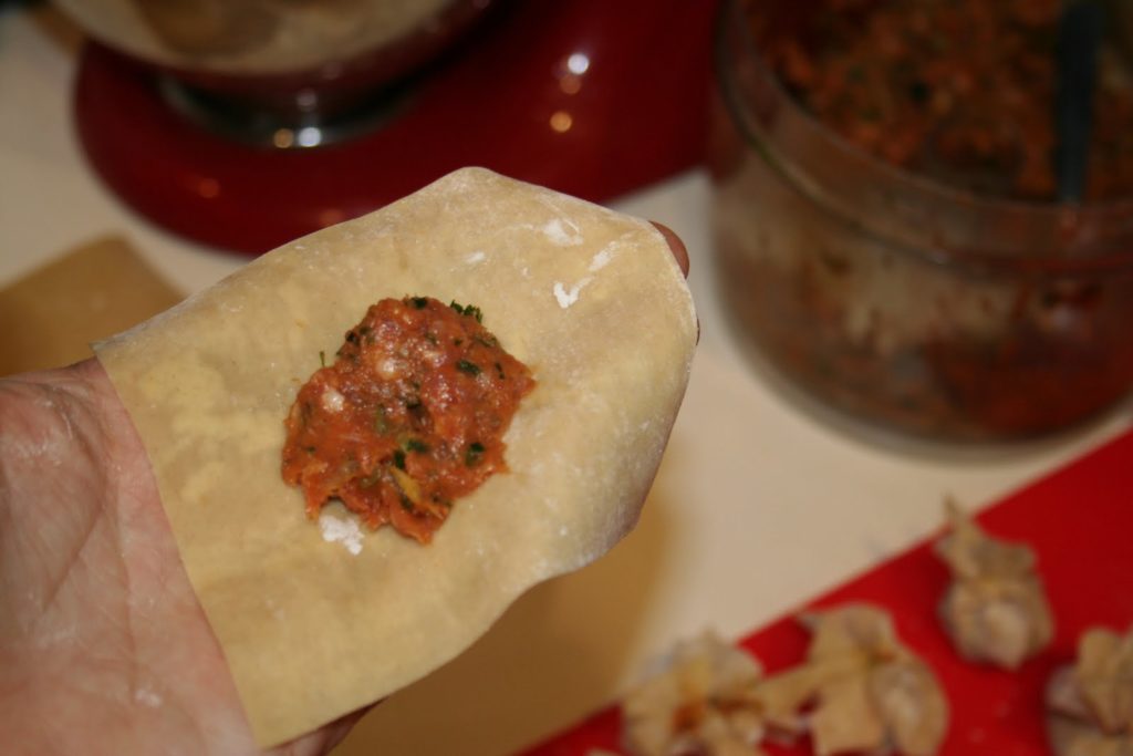 - Prendre une feuille de wonton et garnir avec l’équivalent d’une cuillerée à café de farce au porc.