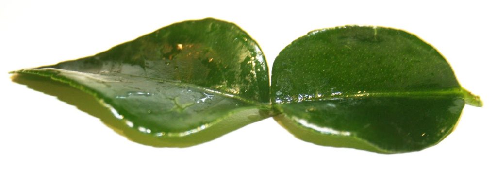 Voilà à quoi ressemble une « feuille de kaffir », appelée également « feuille de citron » ou « feuille de combava ». Elle se vend souvent surgelée dans les épiceries asiatiques.