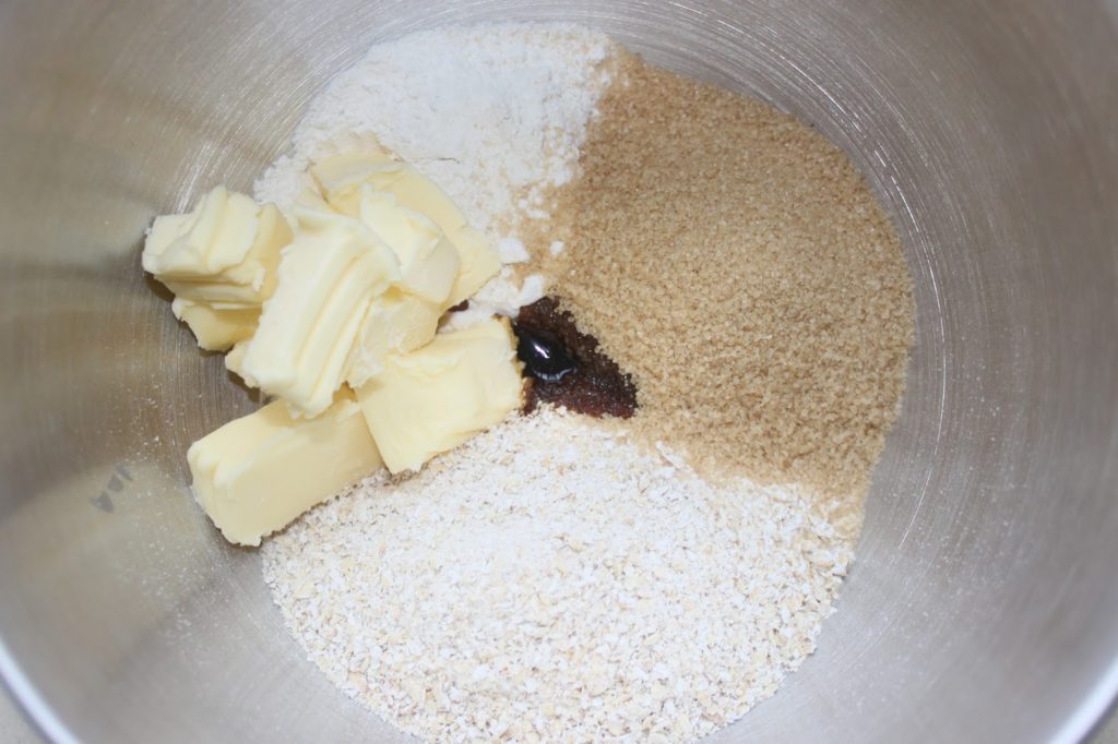 Dans la cuve de votre robot ou dans un récipient, mettez les flocons d’avoine, la cassonade, la farine, la vanille liquide et le beurre demi-sel.