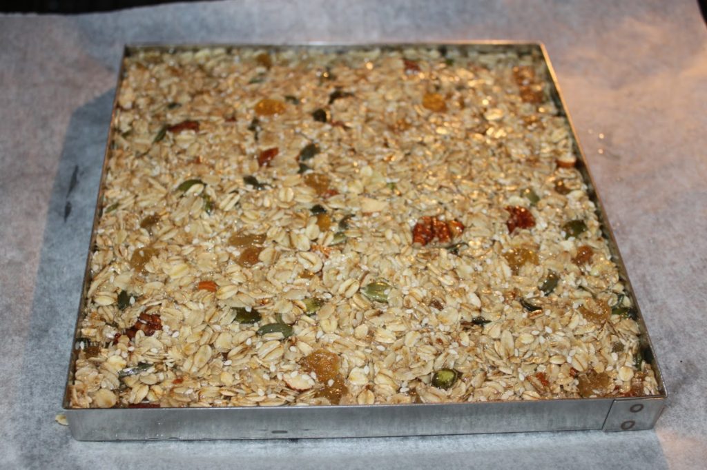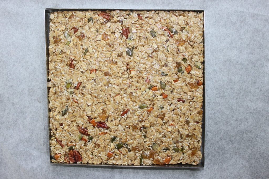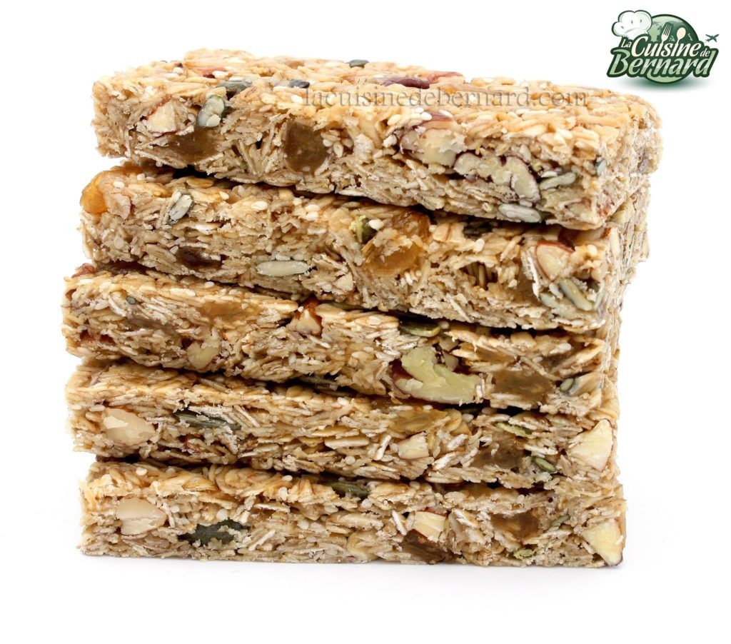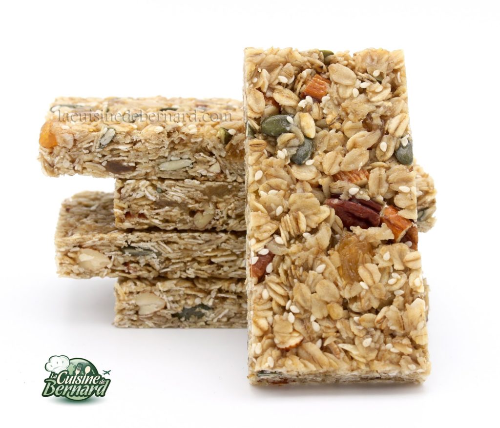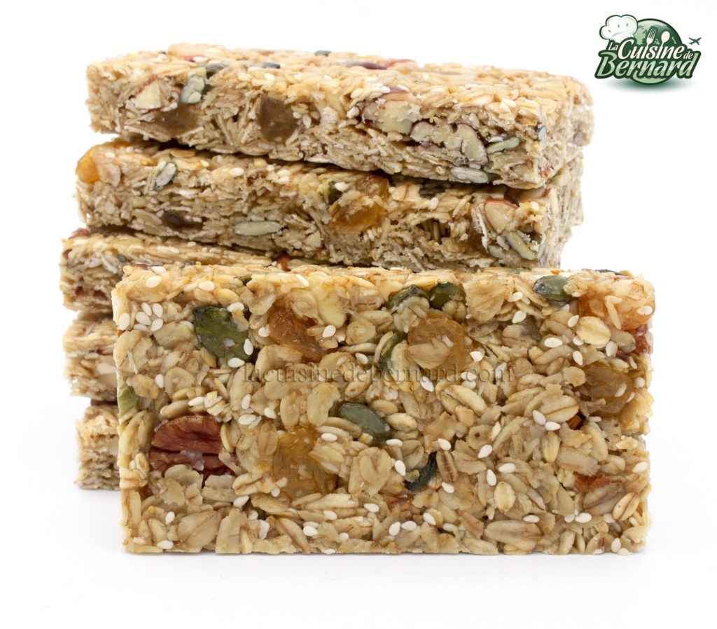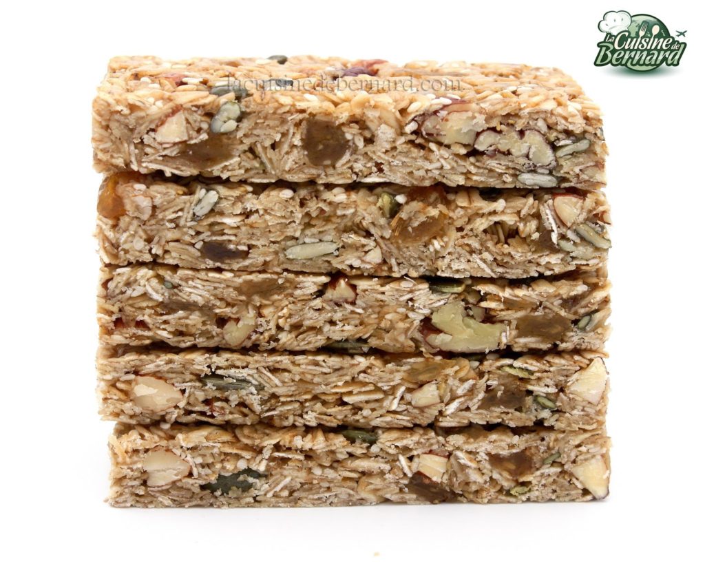 Au cœur de l’été, vous allez peut-être vous balader en famille. Je vous propose ces barres de céréales pour vous apporter de l’énergie ! Très simples à faire, elles sont en plus délicieuses. Quelques fruits secs et plein de flocons d’avoine, j’y mets du sirop de glucose qui évite une cristallisation. Vous pourrez ainsi les conserver très longtemps. N’hésitez pas non plus à y mettre tout ce que vous voulez et à varier les quantités de graines.