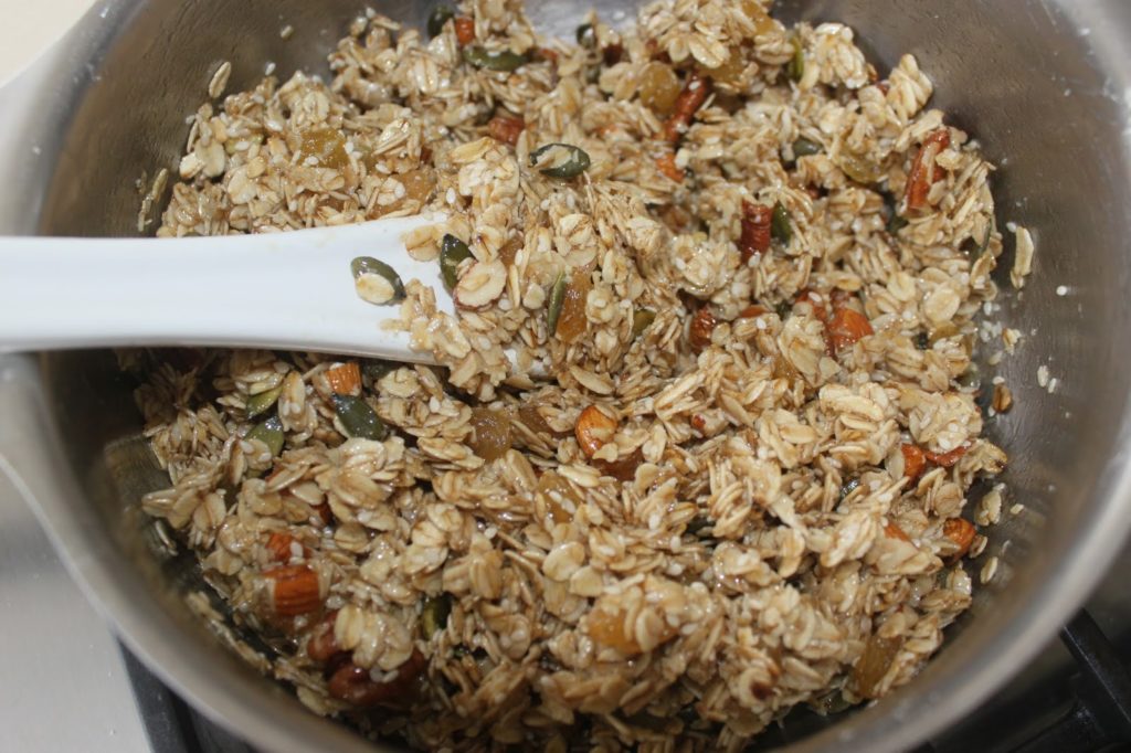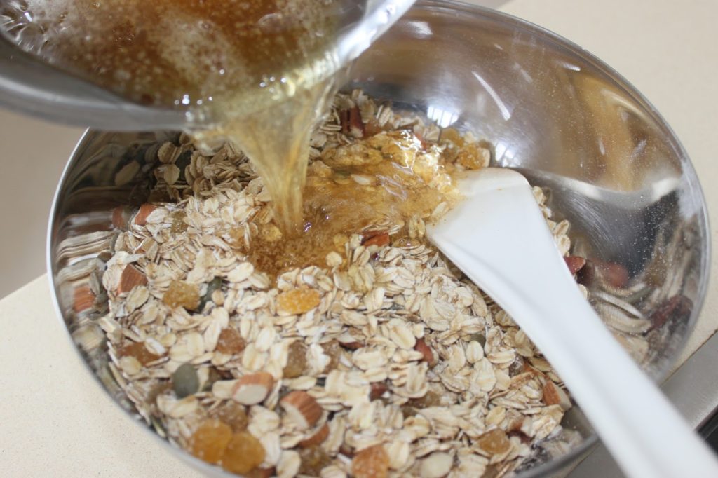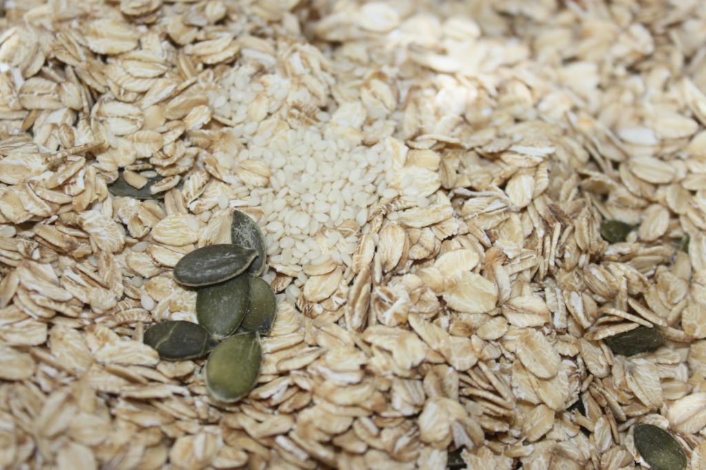 - Versez les flocons d’avoine, les graines de sésame et les graines de courge dans un récipient.