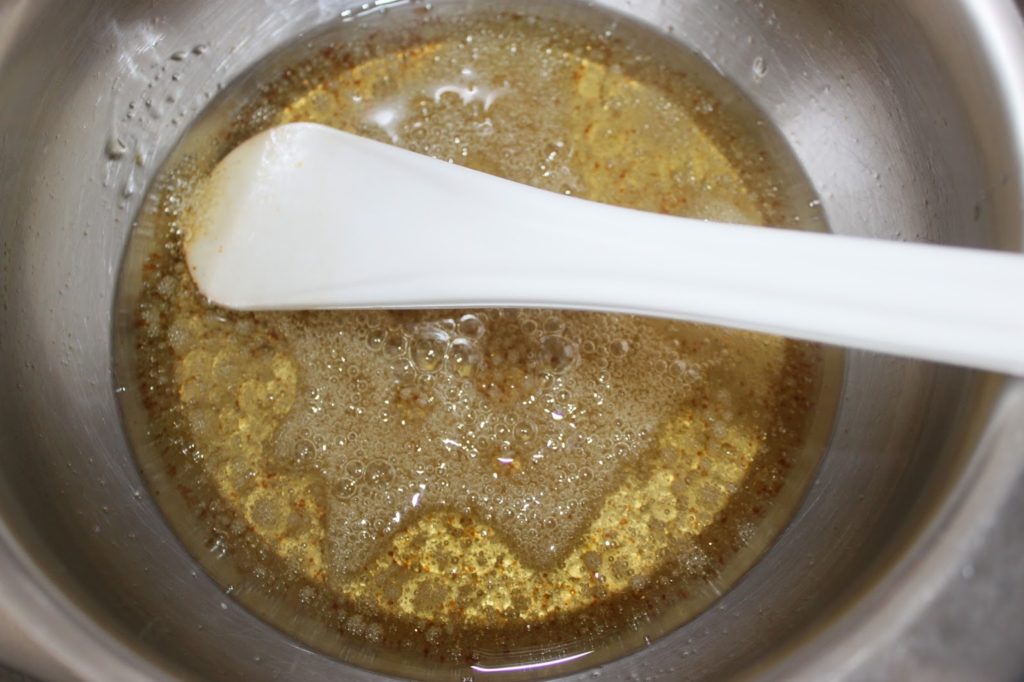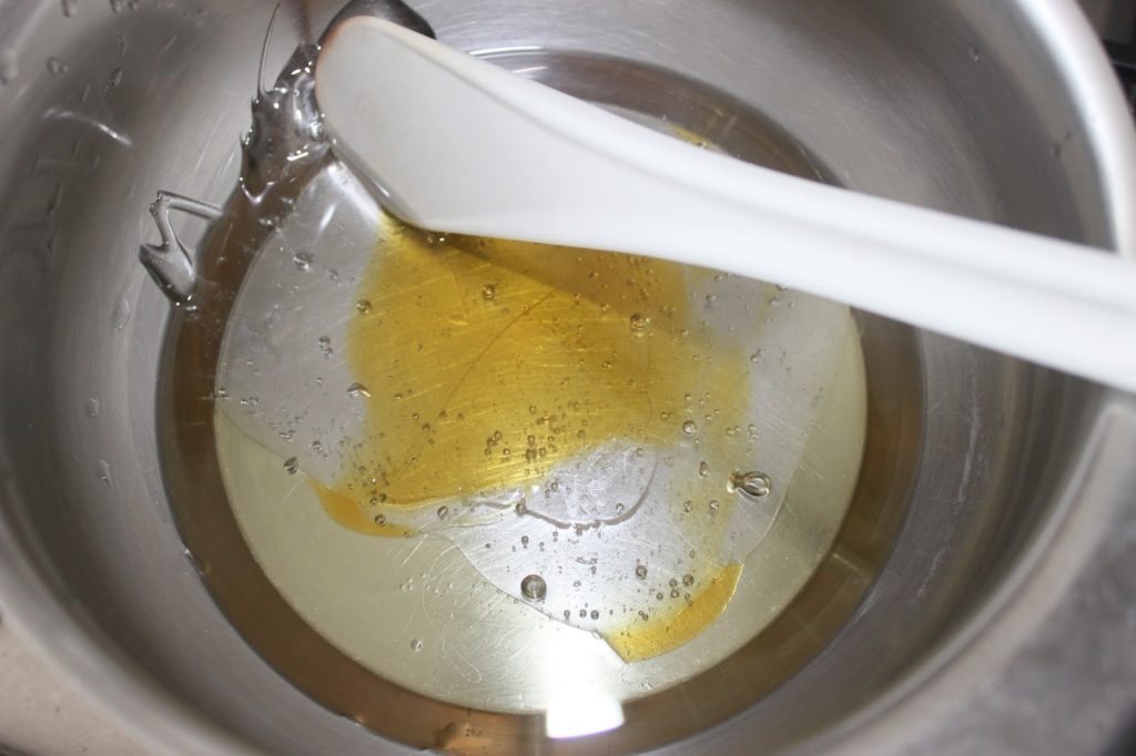 Dans une petite casserole, versez l’huile, le golden syrup, la vanille liquide et le sirop de glucose.