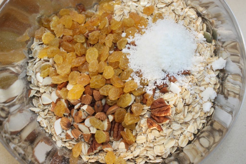 - Ajoutez les raisins secs, la noix de coco, les amandes coupées et les noix de pécan en morceaux.