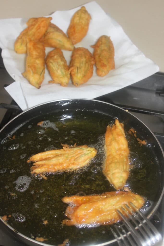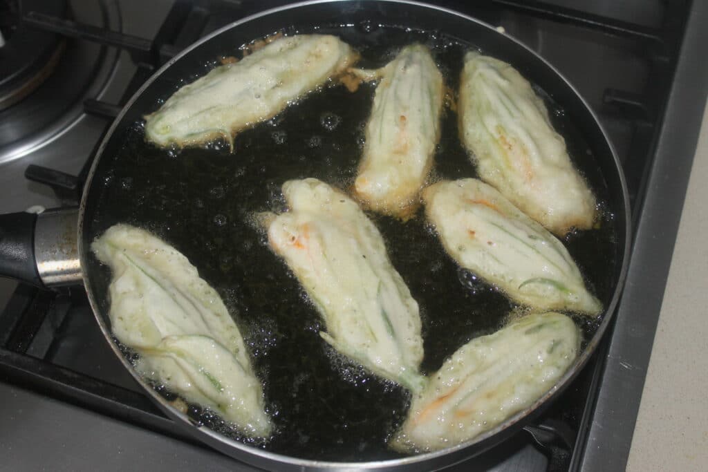 Calentar una sartén con 3 centímetros de aceite. Cuando el aceite esté caliente (180°C), retirar el exceso de pasta de las flores y sumergirlas en el aceite.