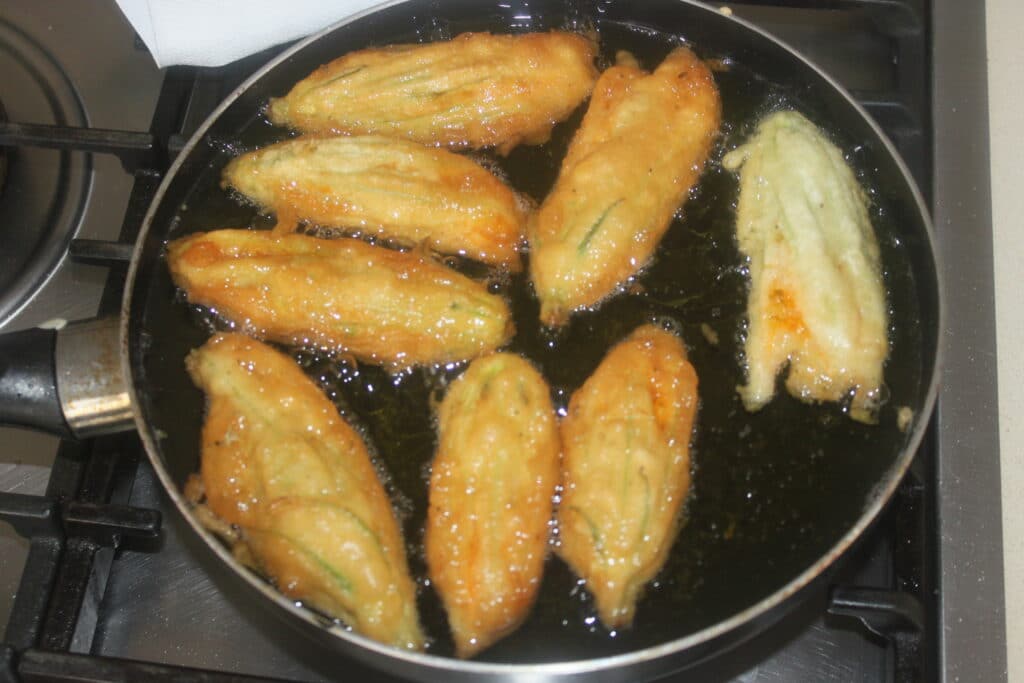 - Faites chauffer une poêle avec 3 centimètres d’huile. Quand elle est bien chaude (180°C), enlevez l’excédent de pâte des fleurs puis plongez-les dans l’huile.
