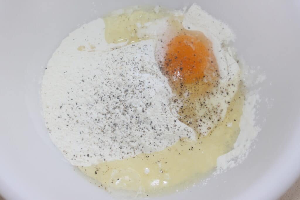 - Dans un récipient, versez la farine, l’œuf, du sel et du poivre, ainsi que la levure chimique.