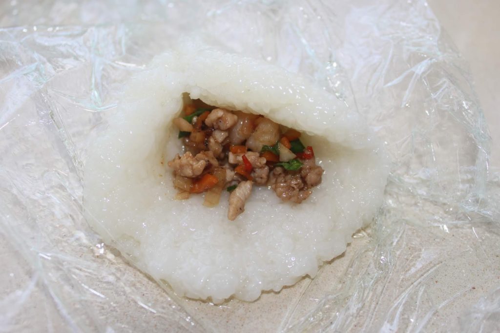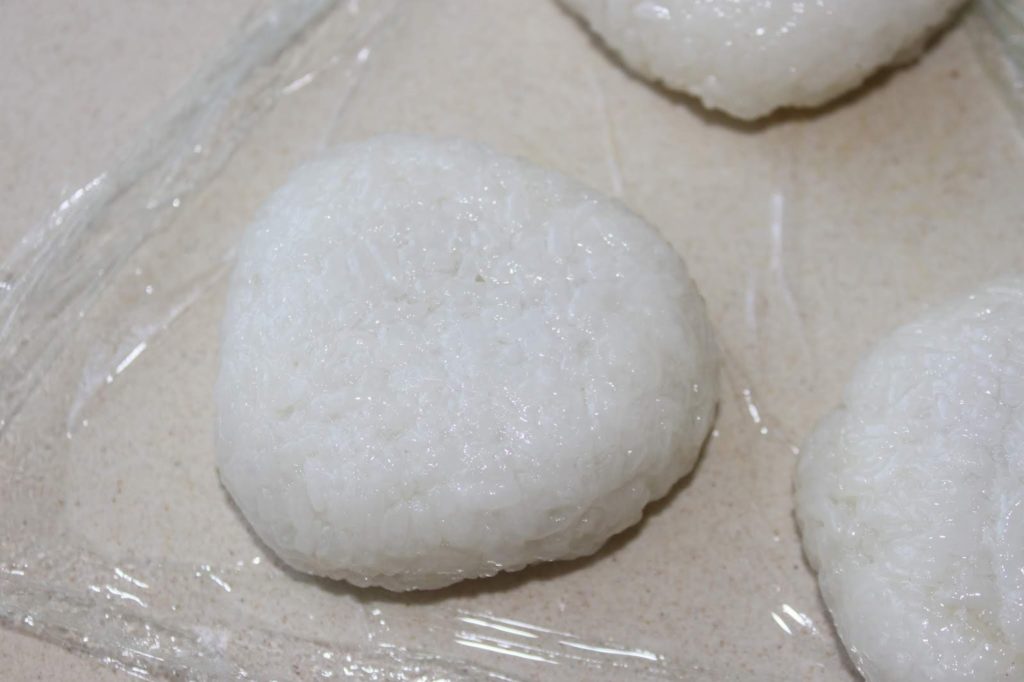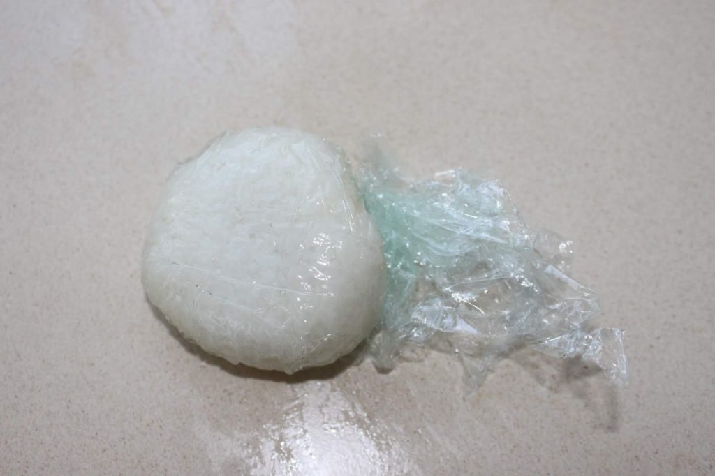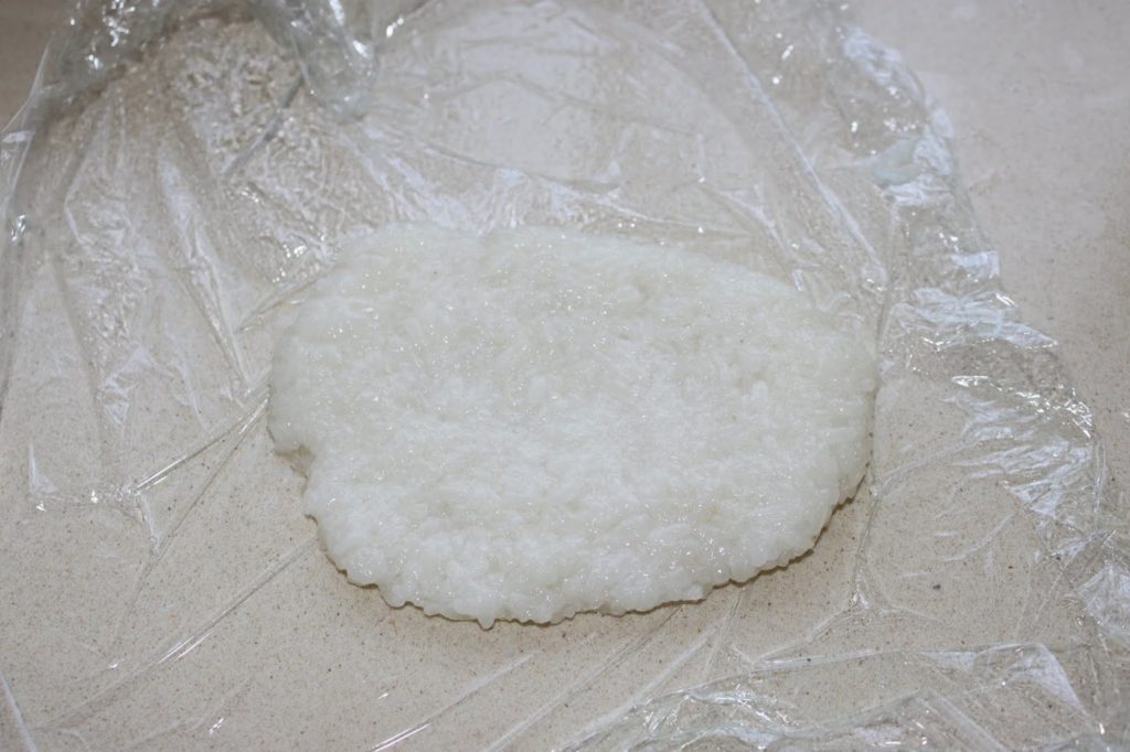 - Le moyen le plus simple est de travailler avec un peu d’huile et un morceau de film étirable. Coupez un morceau de film, posez-le sur le plan de travail. Versez un peu d’huile sur le film et étalez-la du bout des doigts. Divisez le riz gluant en 6. Posez une boule sur le film et étalez-la en une sorte de disque.