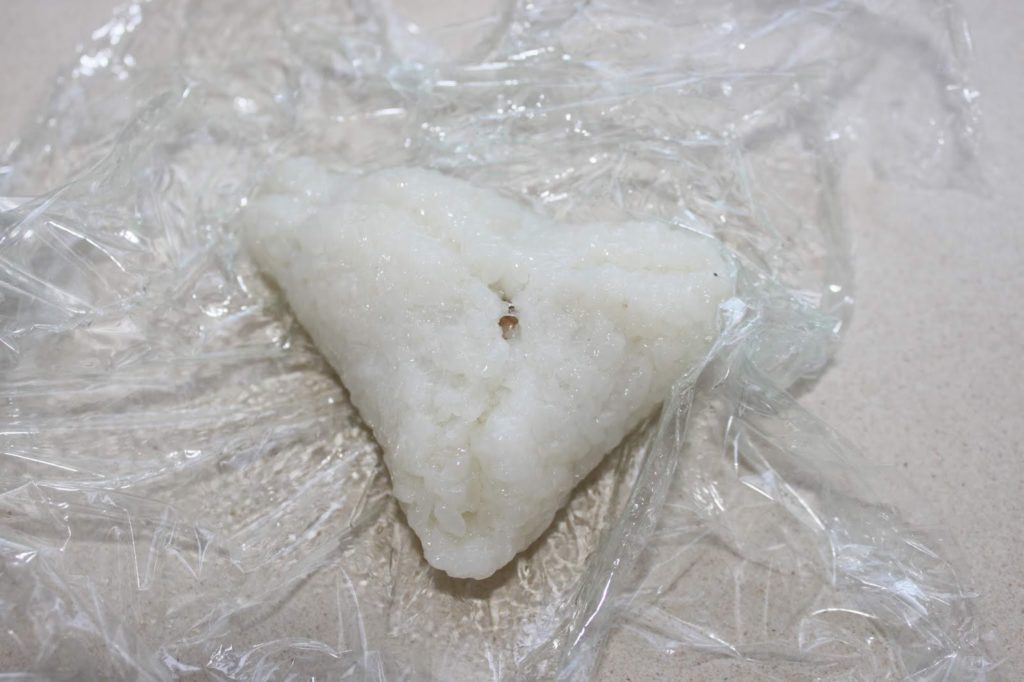 - Quand la boule est parfaitement scellée, posez-la sur un autre film étirable huilé. Faites de même pour le reste du riz et de farce.