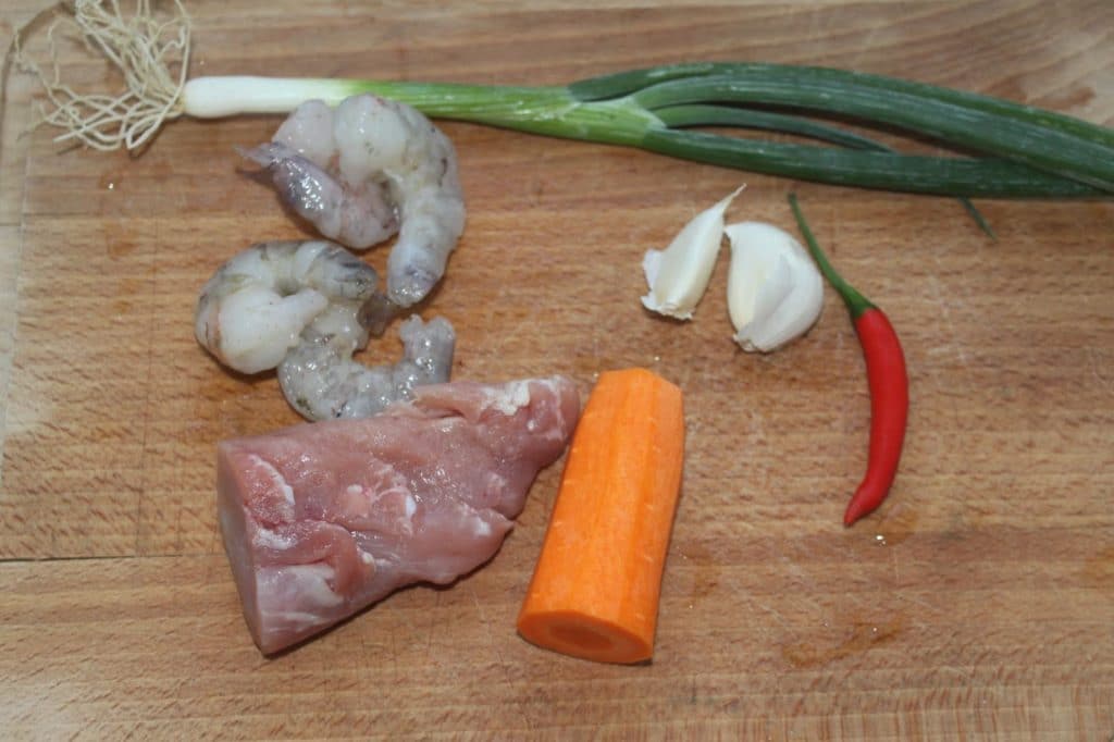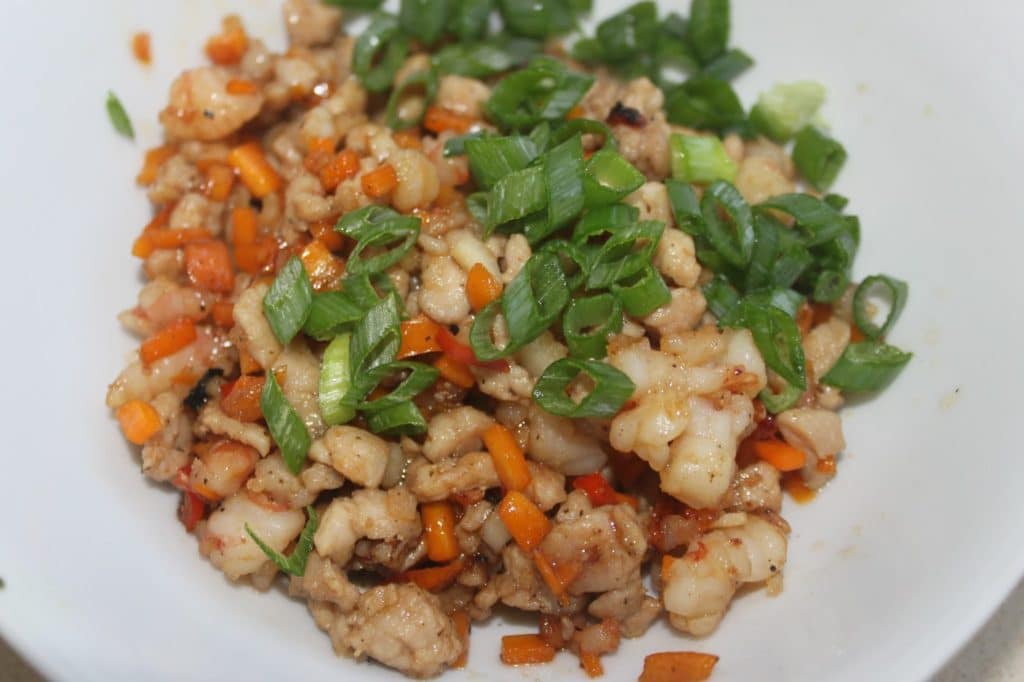 - Pour la farce, hachez le porc et les crevettes. Coupez en petits morceaux les 50g de carotte, le piment (sans les graines) et l’ail.
