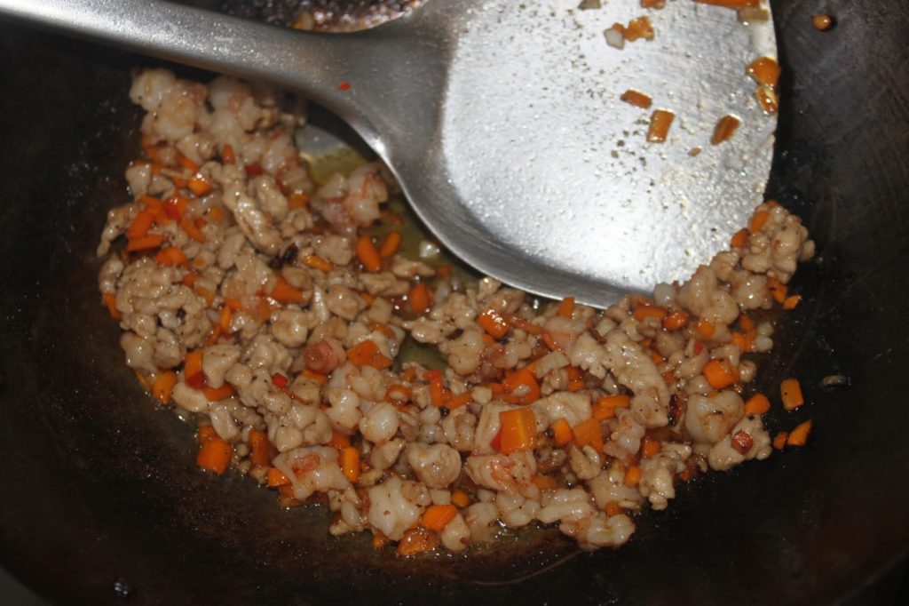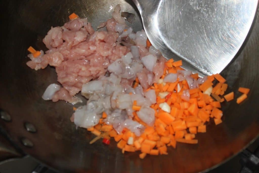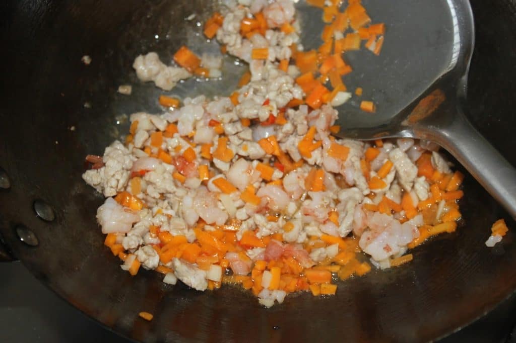 Versez 3-4 cuillerées à soupe d’huile dans un wok (ou une poêle) sur feu fort. Ajoutez l’ail, le piment, les carottes, le porc et les crevettes.