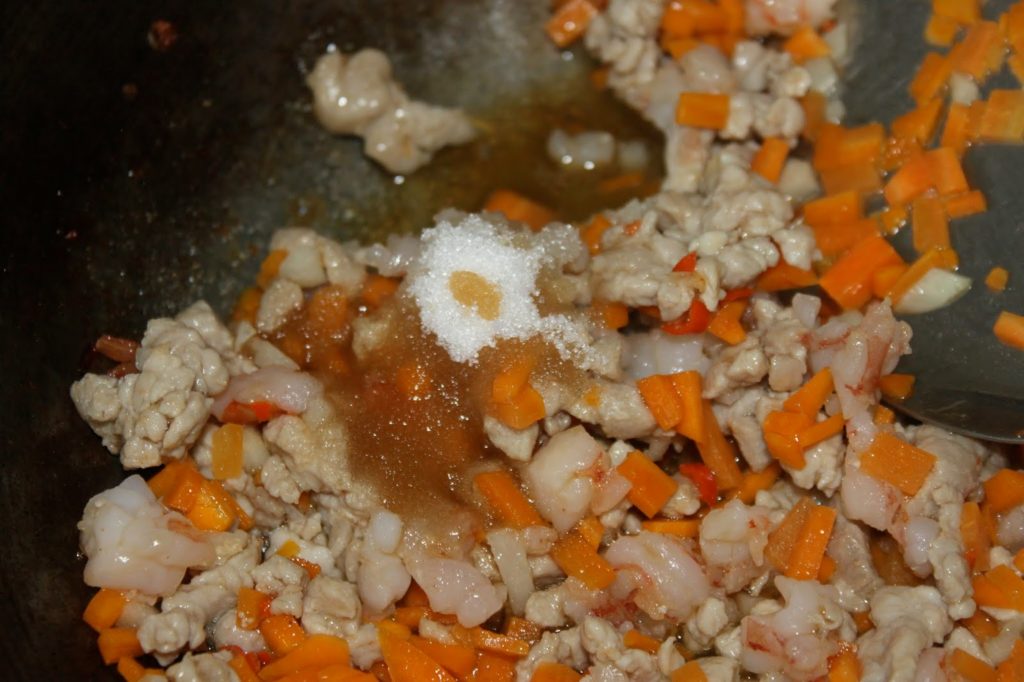 - Ajoutez le sucre, le nuoc mâm. Poivrez à votre goût.