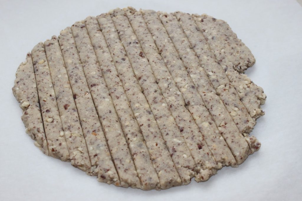 - Coupez des bandes dans la pâte dans un sens et dans l’autre pour réaliser des petits biscuits.