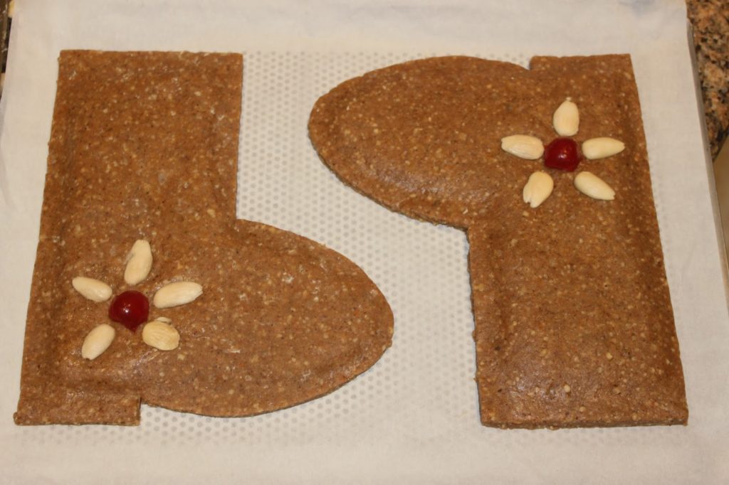 - Faites de même pour toute la pâte et la pâte d’amande-noix. Posez les bottes au fur et à mesure sur une plaque de cuisson garnie de papier sulfurisée.