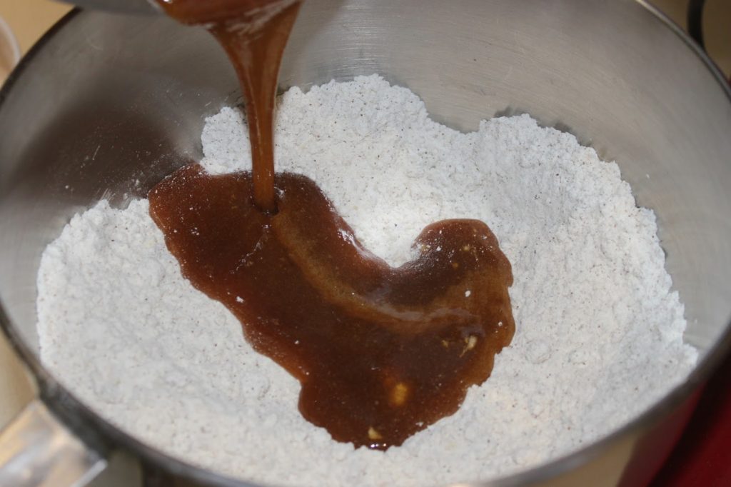 - Versez dans la pâte et mélangez jusqu’à avoir une pâte homogène.