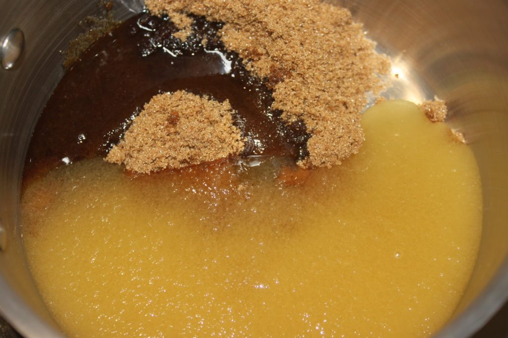 - Versez la vergeoise brune, le miel, la vanille liquide et les 15g d’eau dans une casserole et portez à frémissement. Sur la photo on dirait du beurre, mais c’est bien du miel que l’on m’a offert !