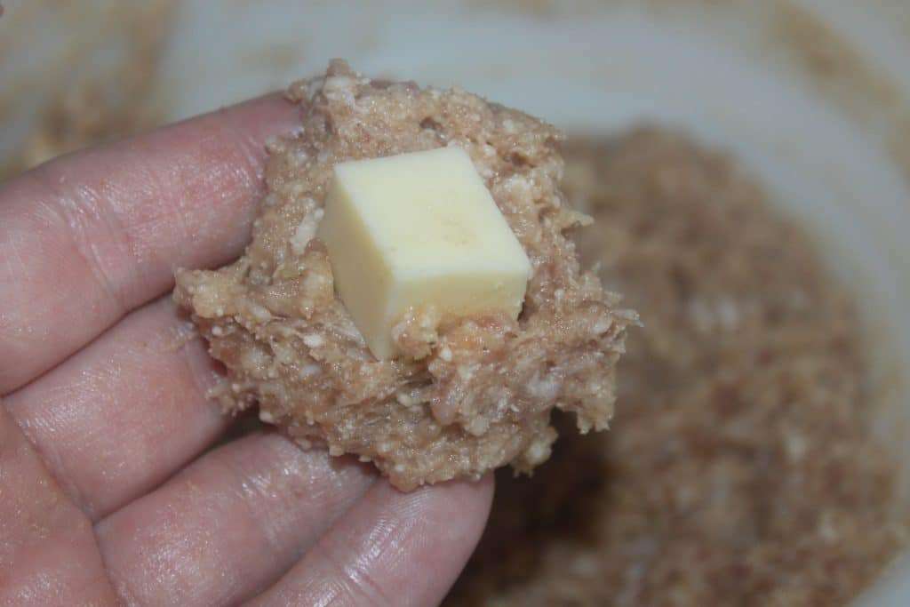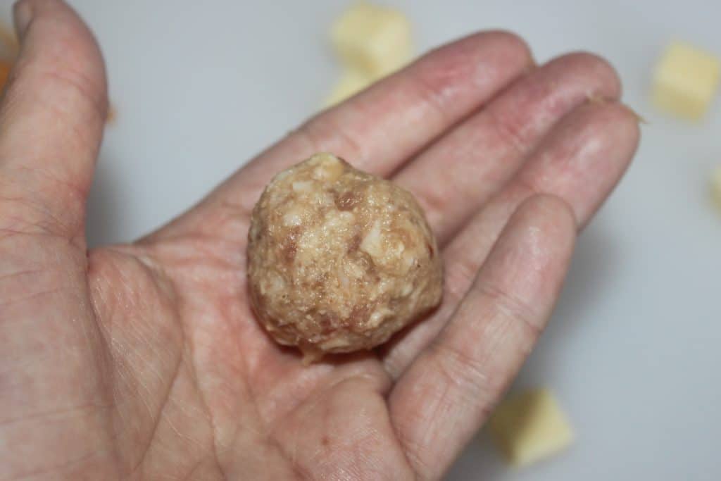 - Prenez l’équivalent d’une cuillère à soupe de farce. Mettez au centre un cube de fromage.