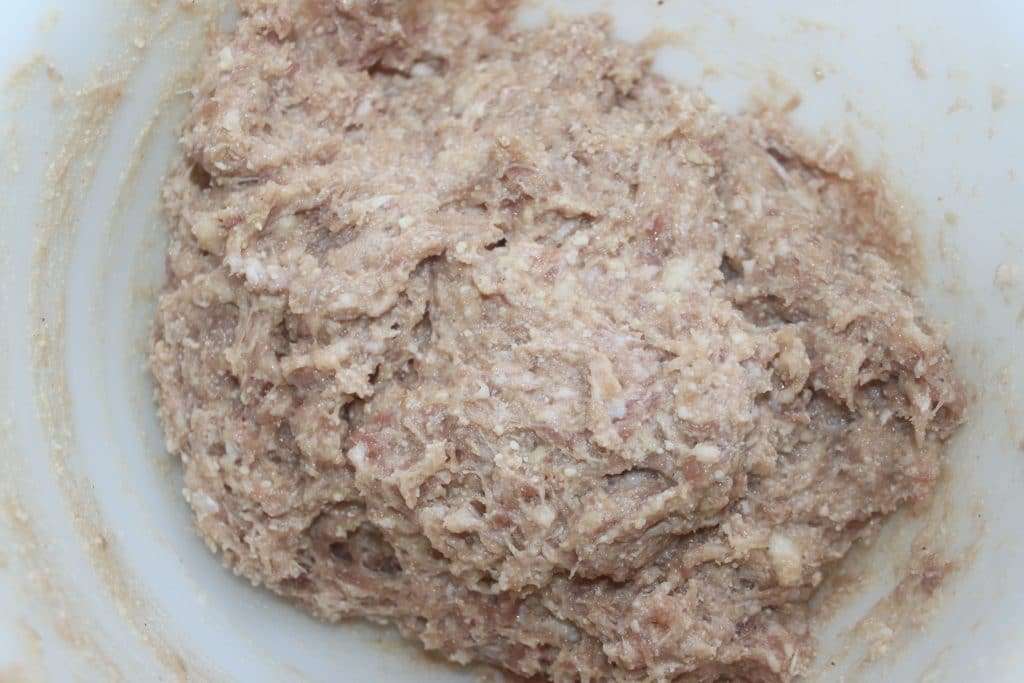 - Mélangez à la main jusqu’à avoir une farce homogène.