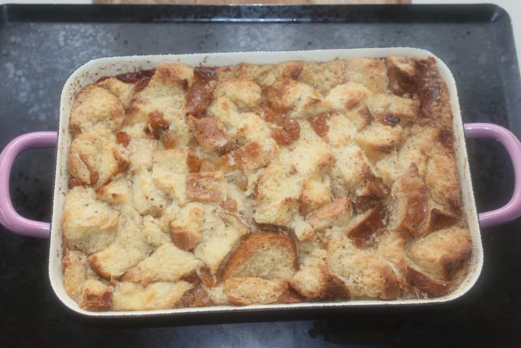 El budín de pan debe tambalearse en el centro. Dejar reposar al sacarlo del horno y disfrutar mientras esté caliente o frío. Una delicia.