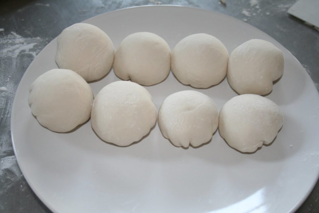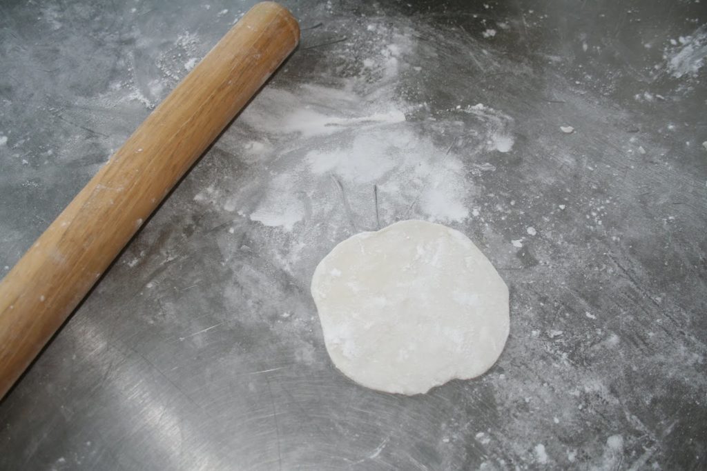 - Étaler chaque morceau pré-aplati, au rouleau pour obtenir des disques de 10cm de diamètre. Il faut étaler la pâte avec le rouleau en passant celui-ci sur la moitié inférieure des disques, puis les tourner de 45° pour étaler une autre partie , ainsi de suite pour étaler uniformément chaque disque.