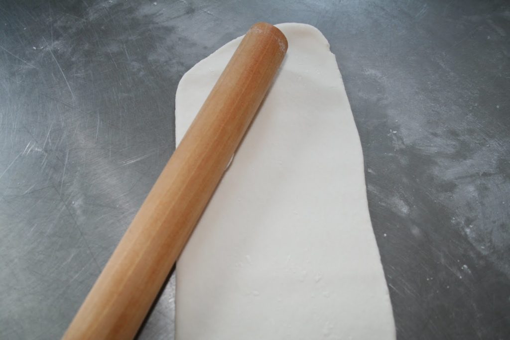 - Au bout de 5 minutes, utiliser un rouleau pour continuer de travailler la pâte, en étalant en longueur. Plier cette bande en trois, la tourner de 90° puis étaler de nouveau en bande. Continuer cette même opération pendant encore 5 minutes.