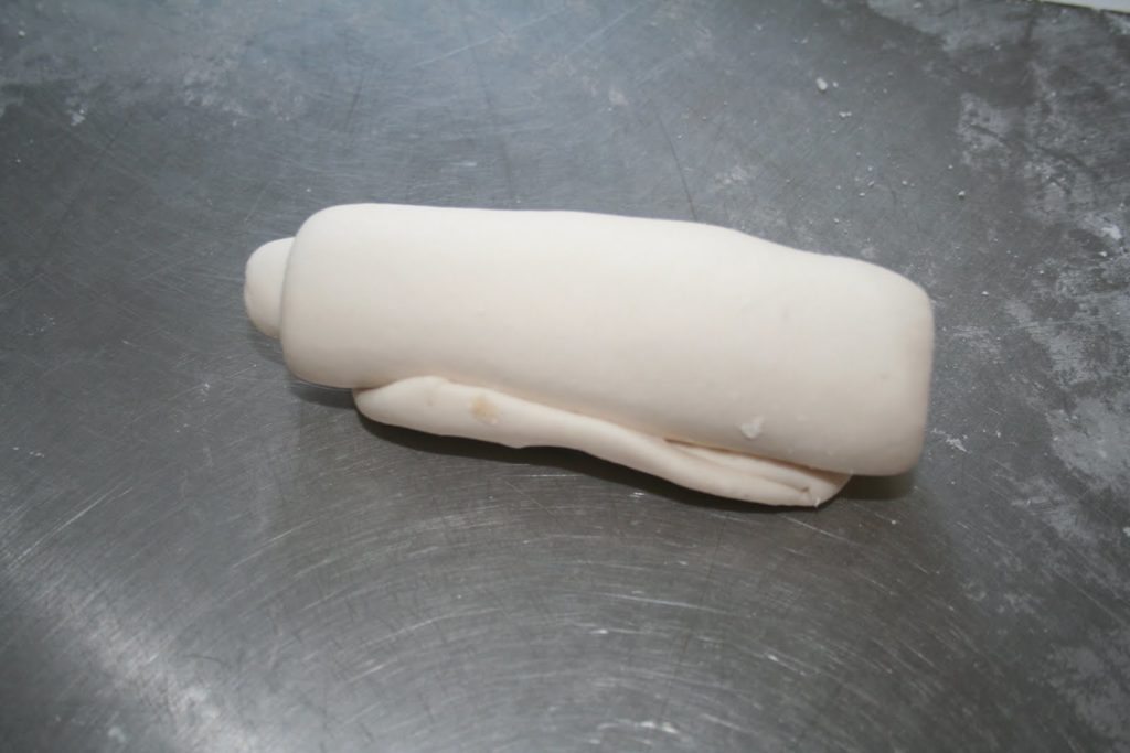 Sur un plan de travail, mettre la farine, faire un puits et y mettre le sucre, les levures et l’eau tiède, puis mélanger et commencer à pétrir la pâte en la pliant et en l’écrasant de la paume de main, plier de nouveau et ainsi de suite.