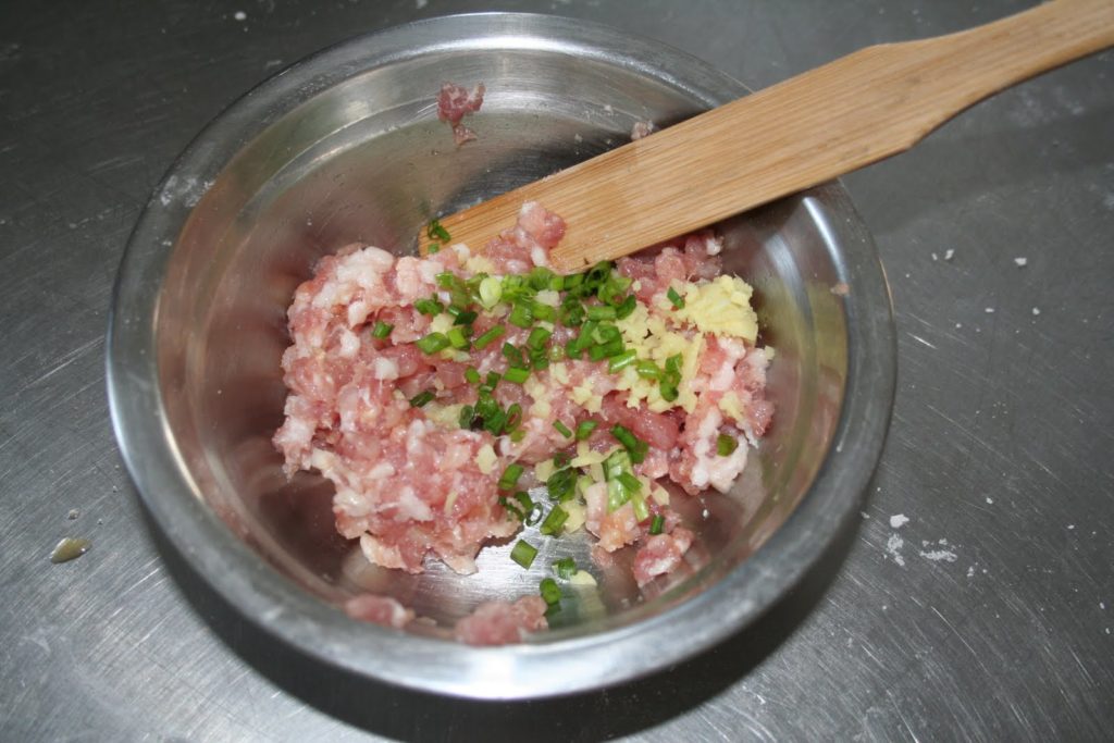 - Commencer par mettre les 30g d’eau avec la viande jusqu’à ce qu’elle l’ait complétement absorbée. Puis préparer la farce en mélangeant bien tous les ingrédients. Mettre au frais pendant la préparation de la pâte.