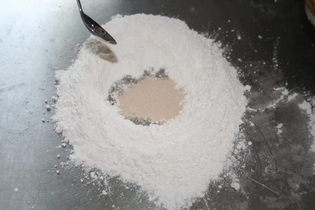 - Sur un plan de travail, mettre la farine, faire un puits et y mettre le sucre, les levures et l’eau tiède, puis mélanger et commencer à pétrir la pâte en la pliant et en l’écrasant de la paume de main, plier de nouveau et ainsi de suite.