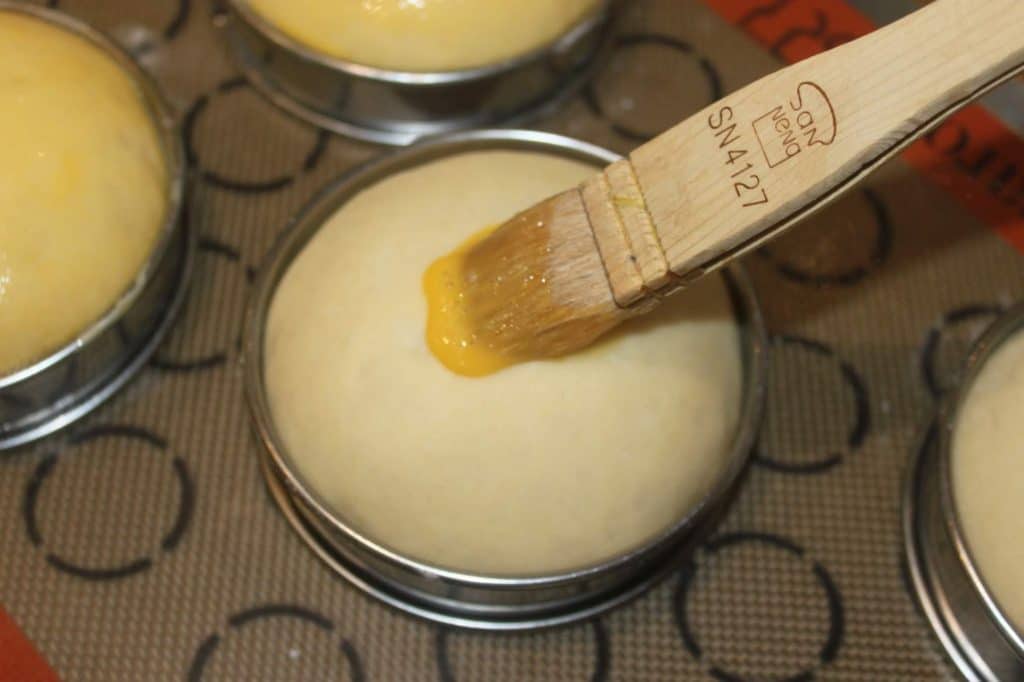 - Laissez pousser pendant 45 minutes. La pâte touche le cercle. Mélangez le jaune d’œuf avec l’eau. Passez la dorure au pinceau sur la surface en étant assez délicat, car si on appuie trop fort, la pâte risque de dégonfler.