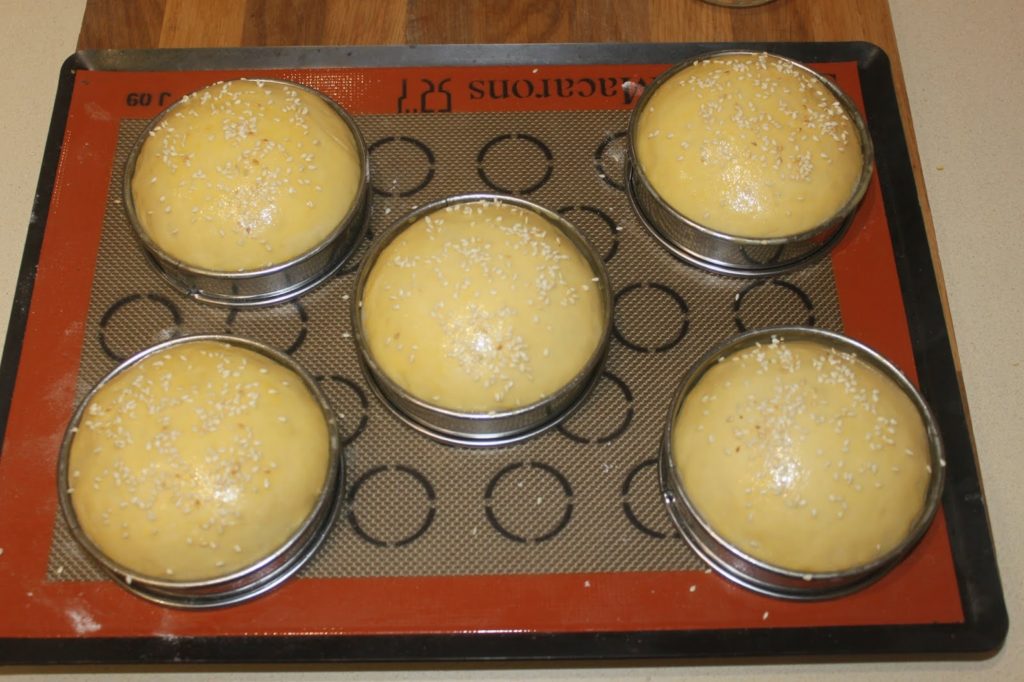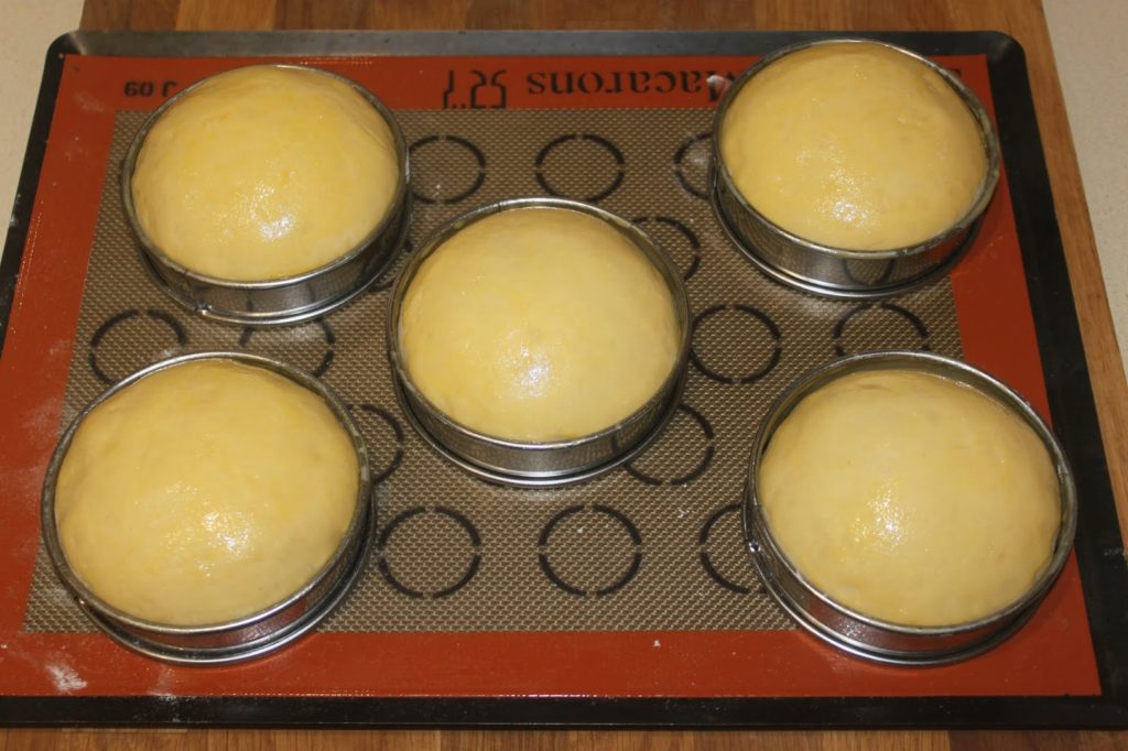 Posez les boulettes sur une plaque garnie de papier cuisson ou d’un tapis de cuisson. Placez des cercles à tartes de 10cm de diamètre et 2,5cm de hauteur, préalablement graissés avec de la bombe de démoulage. Bien sûr, vous pouvez faire sans et changer le poids (et du coup) la taille des boulettes de pâte !
