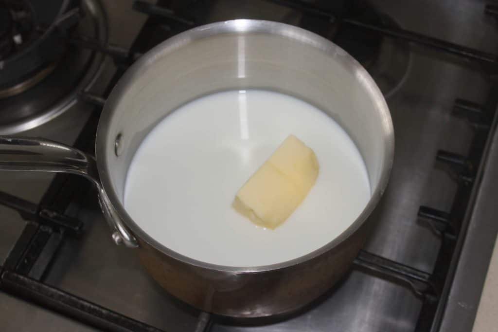 Mettez le lait et le beurre à chauffer très légèrement sur feu doux. Le beurre doit juste fondre et le tout avoir la température d’un bon bain chaud.