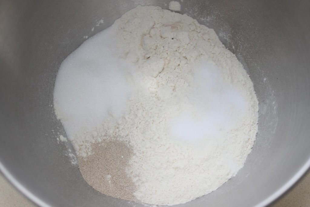 - Placez dans la cuve d’un robot ou dans un récipient, la farine, la levure, le sel et le sucre.