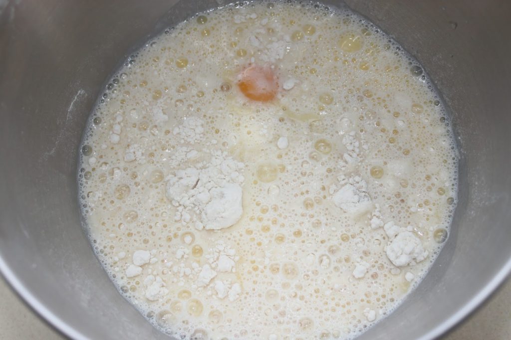 - Mélangez puis versez le lait (au beurre fondu) et l’œuf.