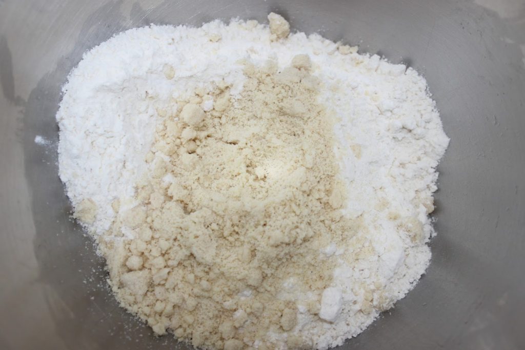Placez la farine, la levure chimique et la poudre d’amande dans un récipient ou dans la cuve de votre robot.