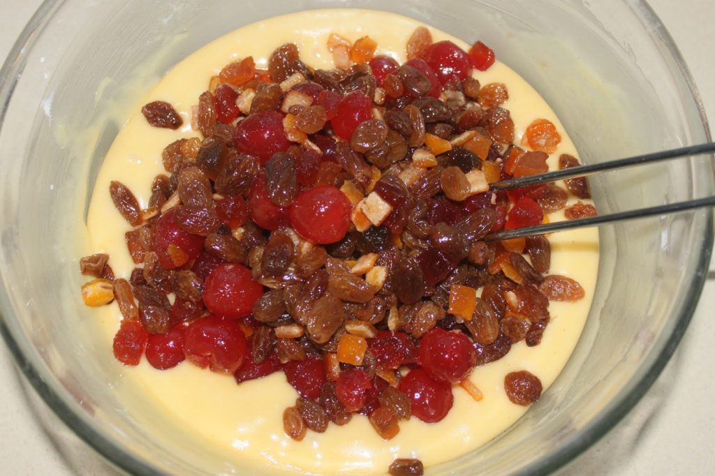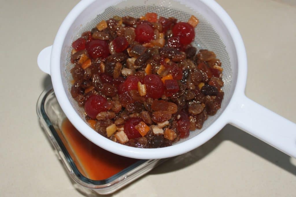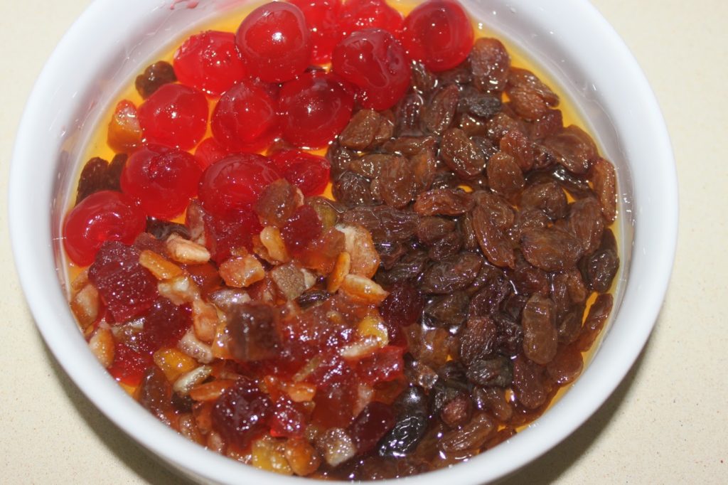 Mettez à tremper la veille les fruits (raisins secs, fruits confits et bigarreaux) dans une quantité suffisante de rhum ambré.