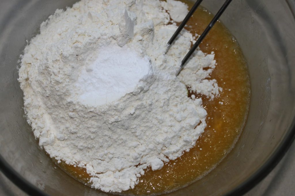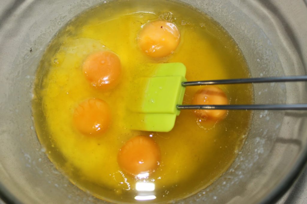 Mélangez bien et ajoutez les œufs. Pesez-les, ne comptez pas ceux sur la photo !! Car j’ai utilisé un moule plus grand et des quantités plus importante !! C’est bien 195g d’œuf en définitive pour le moule à cake utilisé.