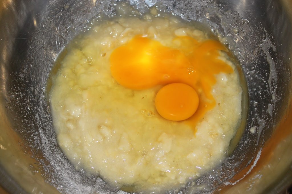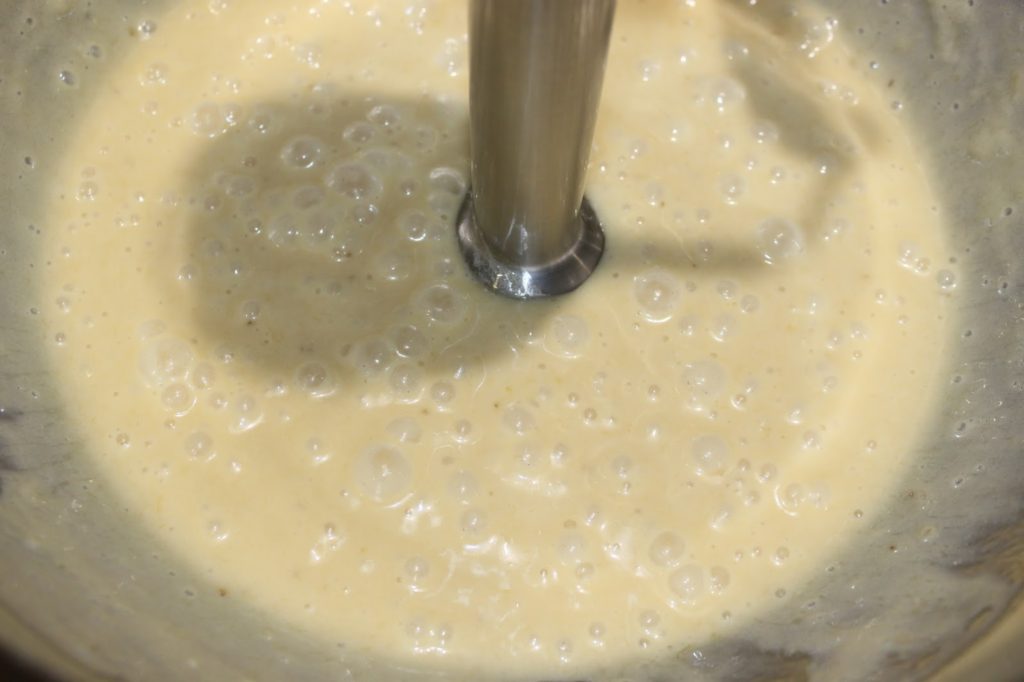 - Pour avoir un cake bien lisse, je mixe avec un mixeur plongeant pour que la banane soit parfaitement incorporée.