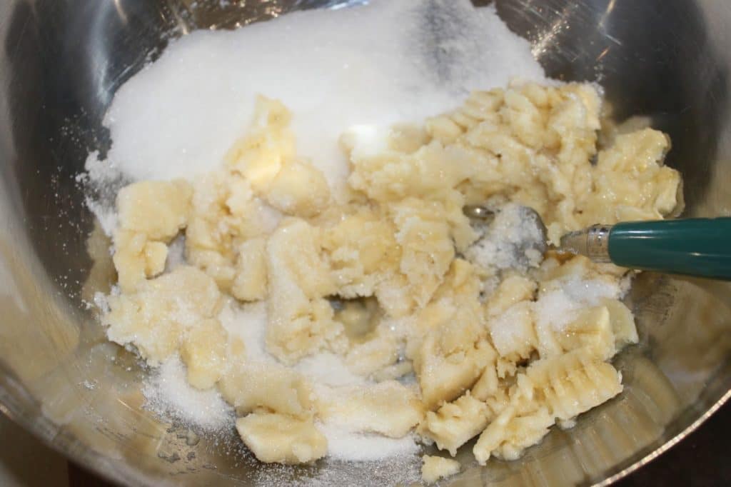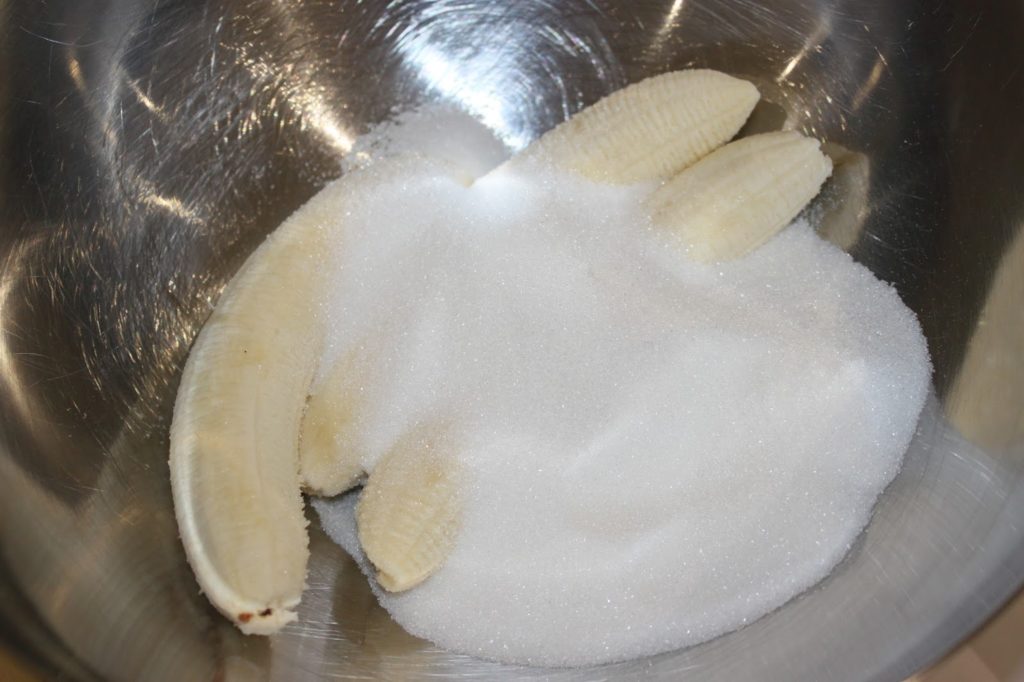 - Placez les bananes épluchées (310g de chair en tout) et le sucre dans un récipient.