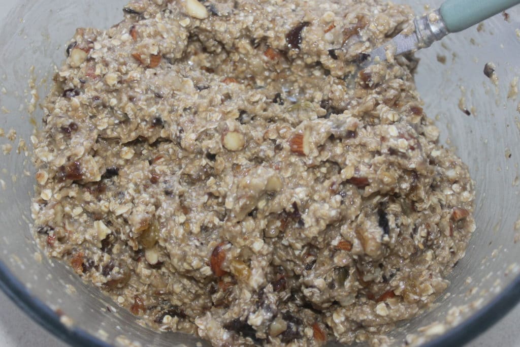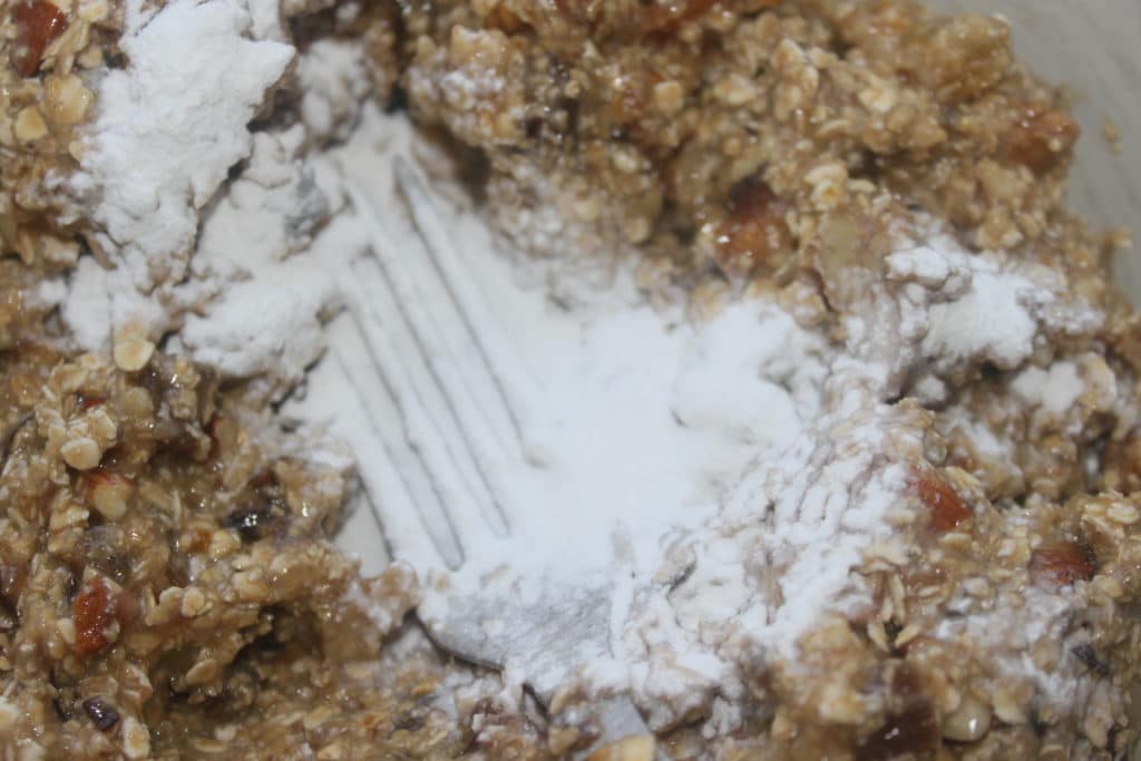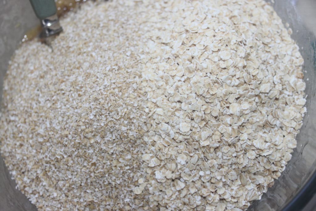 Mélangez bien puis ajoutez avec le son d’avoine (à gauche sur la photo) et les flocons d’avoine.