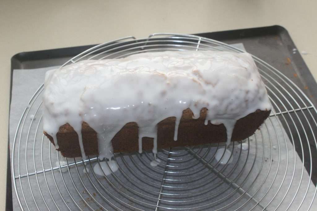 Prepare el glaseado mezclando el zumo de limón y el azúcar glas. Verter sobre el pastel.