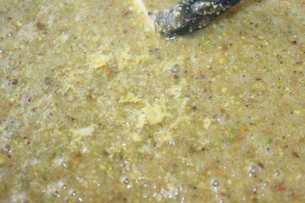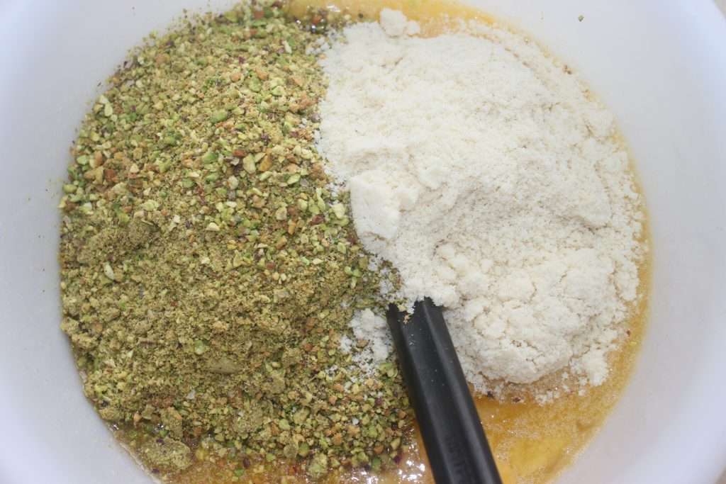 Mezclar y luego verter 225 g de pistacho en polvo y el polvo de almendra.
