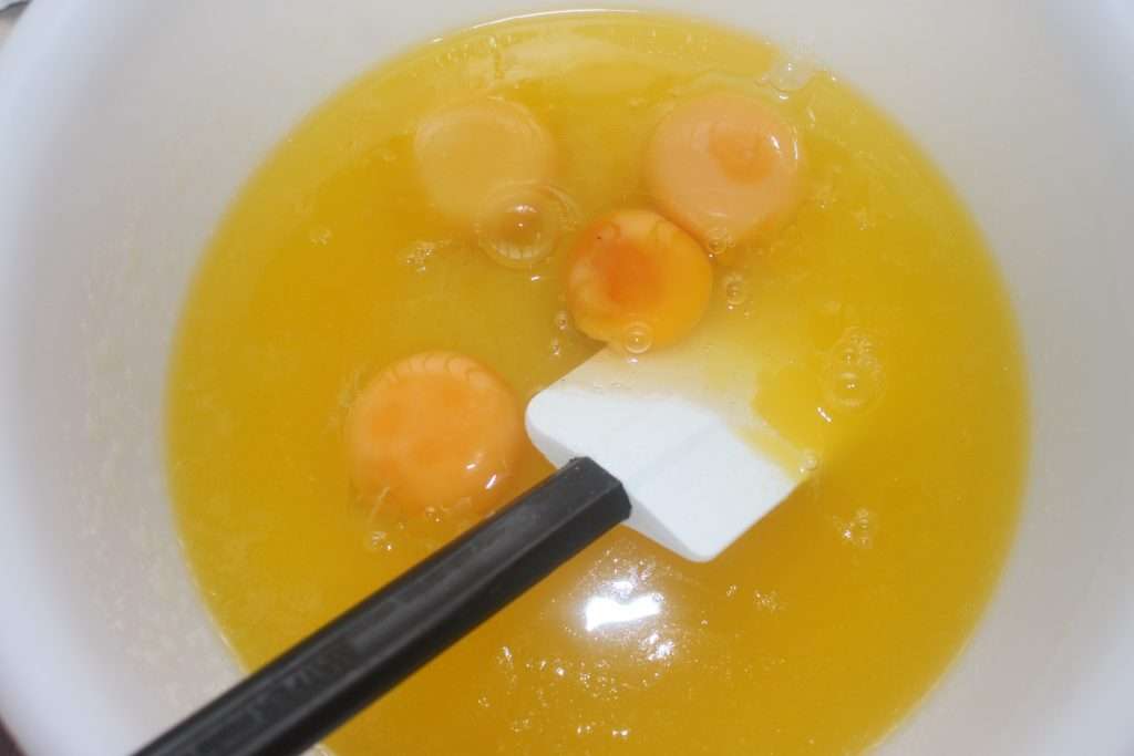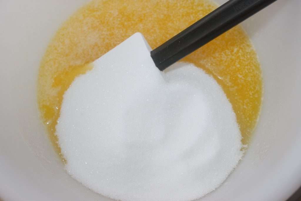 Poner la mantequilla derretida y el azúcar en un bol. El azúcar puede parecer mucho, pero la textura del pastel será perfecta y al final no será demasiado dulce. Al contrario, es perfecto tal y como es. Usando menos, cambiará el resultado final.