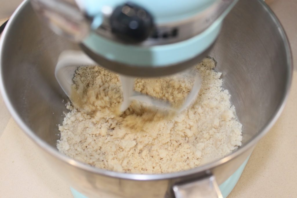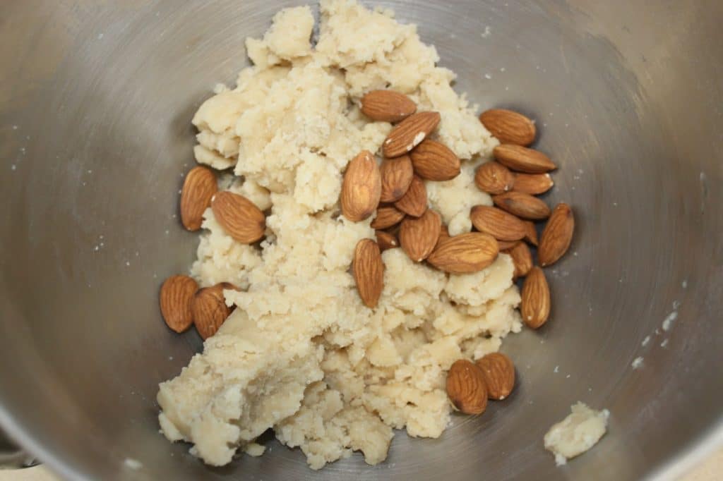 - Versez le vin blanc sec (que vous pouvez remplacer par de l’eau), mélangez pour que la pâte se forme puis ajoutez les amandes. Un dernier petit mélange et c’est bon !
