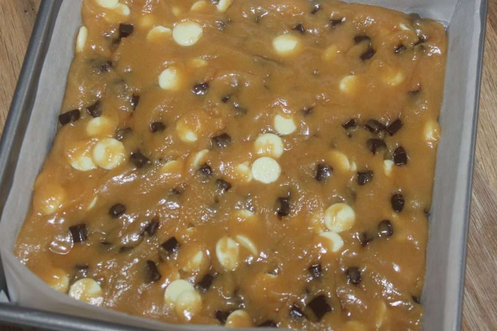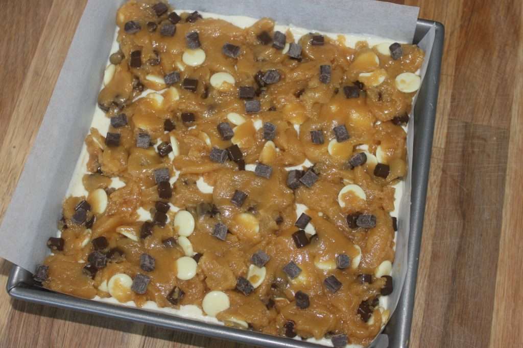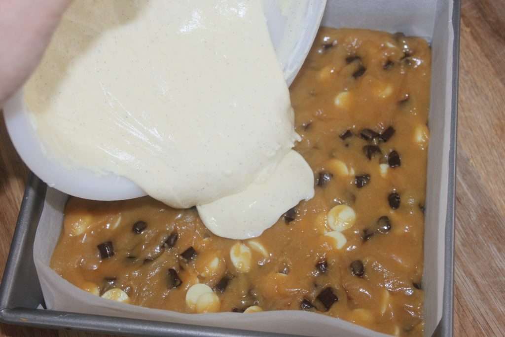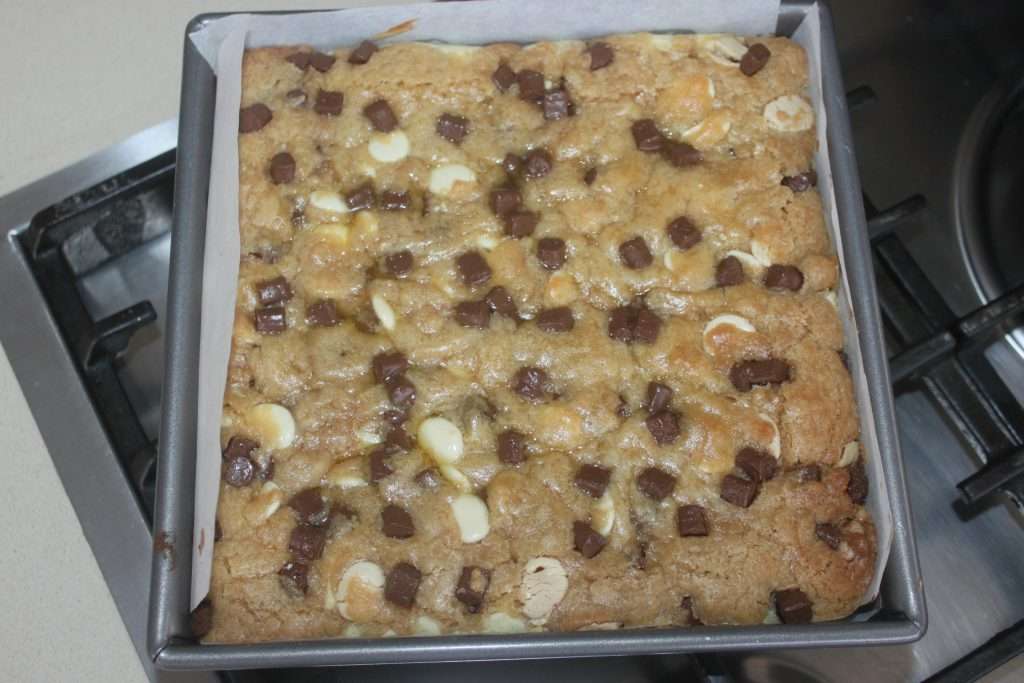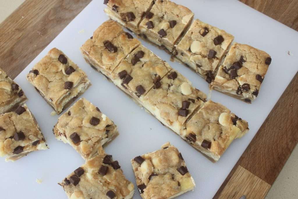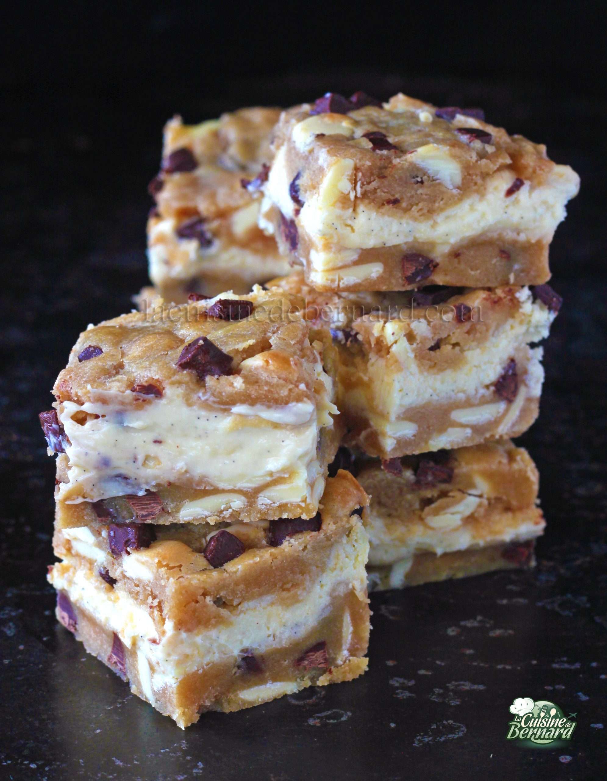 Tengan cuidado, estos pedacitos de pastel son totalmente malignos. Esta deliciosa masa de galleta se hornea con un relleno de queso crema. Es como tener una refrescante capa de tarta de queso en medio de un diluvio de trocitos de chocolate negro y blanco. Te advierto desde ya que esto es un verdadero escándalo, ya que no es realmente recomendable justo antes del verano y del traje de baño. Quizás estoy siendo un poco cruel.