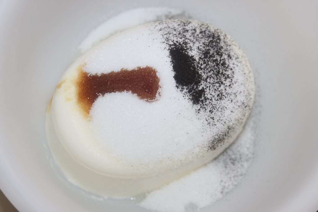 - Pour la crème au cream cheese. Versez le cream cheese dans un récipient avec le sucre et la vanille. Si vous n’avez pas une gousse de vanille, mettez une cuillerée à café de vanille liquide et un peu de vanille en poudre (facultatif).