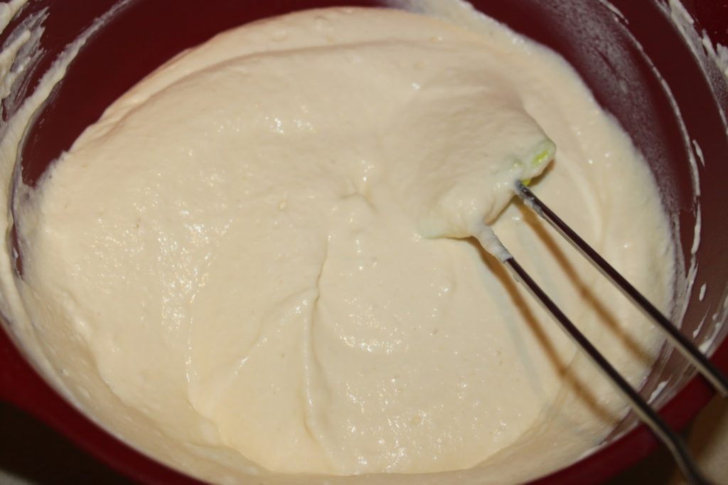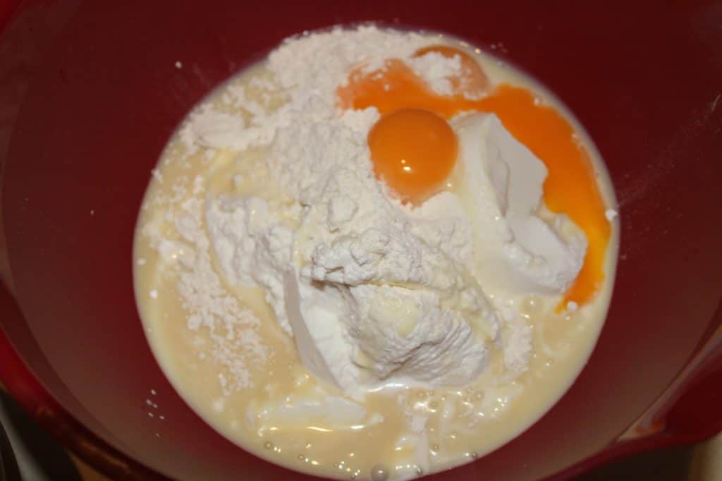 - Dans un autre récipient, mélangez le lait concentré sucré, les jaunes, la ricotta et la farine.